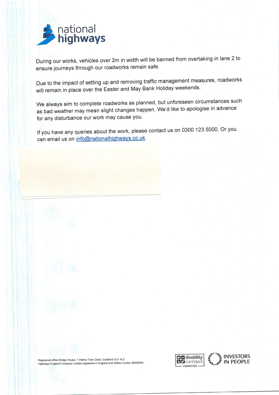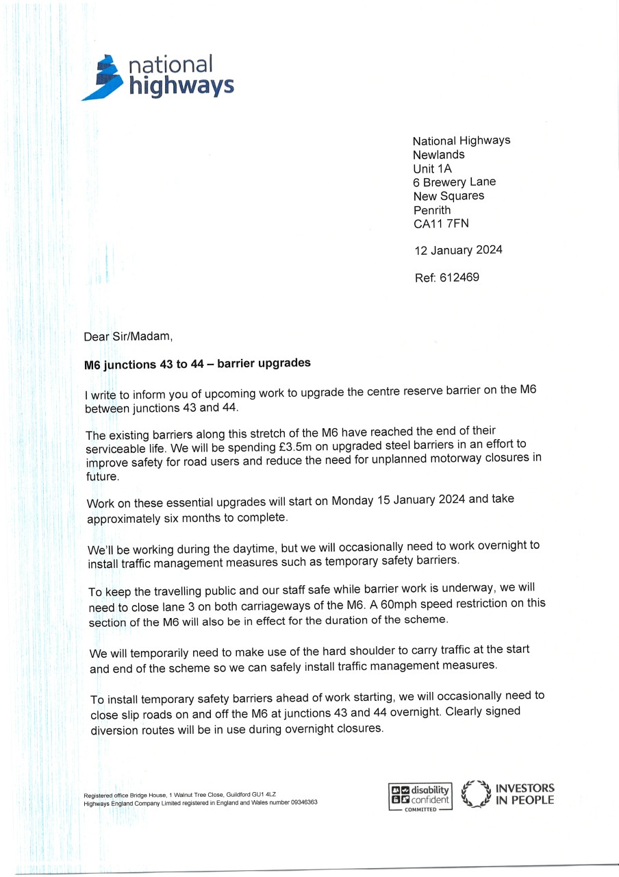 Information from National Highways regarding work on the M6 between Junction 43 and 44 with effect from 15 January 2024